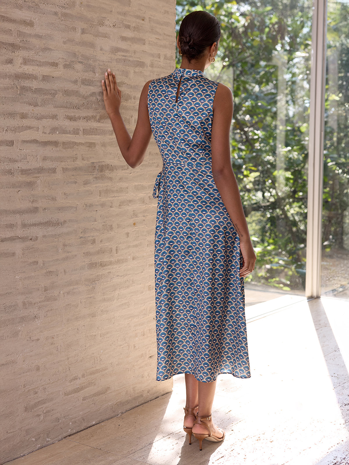 asymmetric,blue,casual,clothing,coll:dresses,coll:vacation,coll:weekend_getaway,dresses,feminine,geometric pattern,in_six_month,invisible zipper,midi,no,not_low_sales,oa251112087,photo_model,regular,regular fit,satin,sleeveless,stand collar,tied&knot,vacation,women