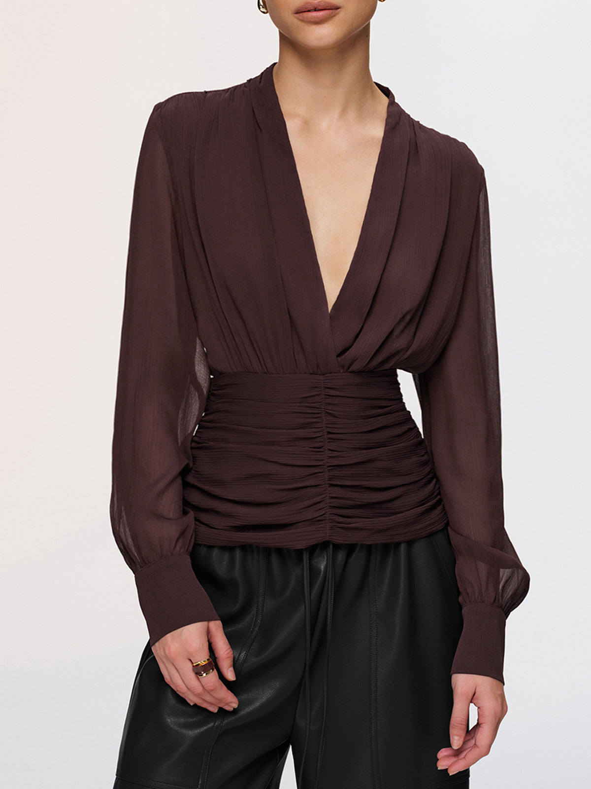 Semi-Sheer Ruched Deep V-Neck Blouse