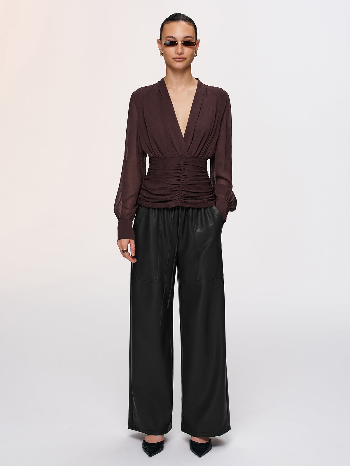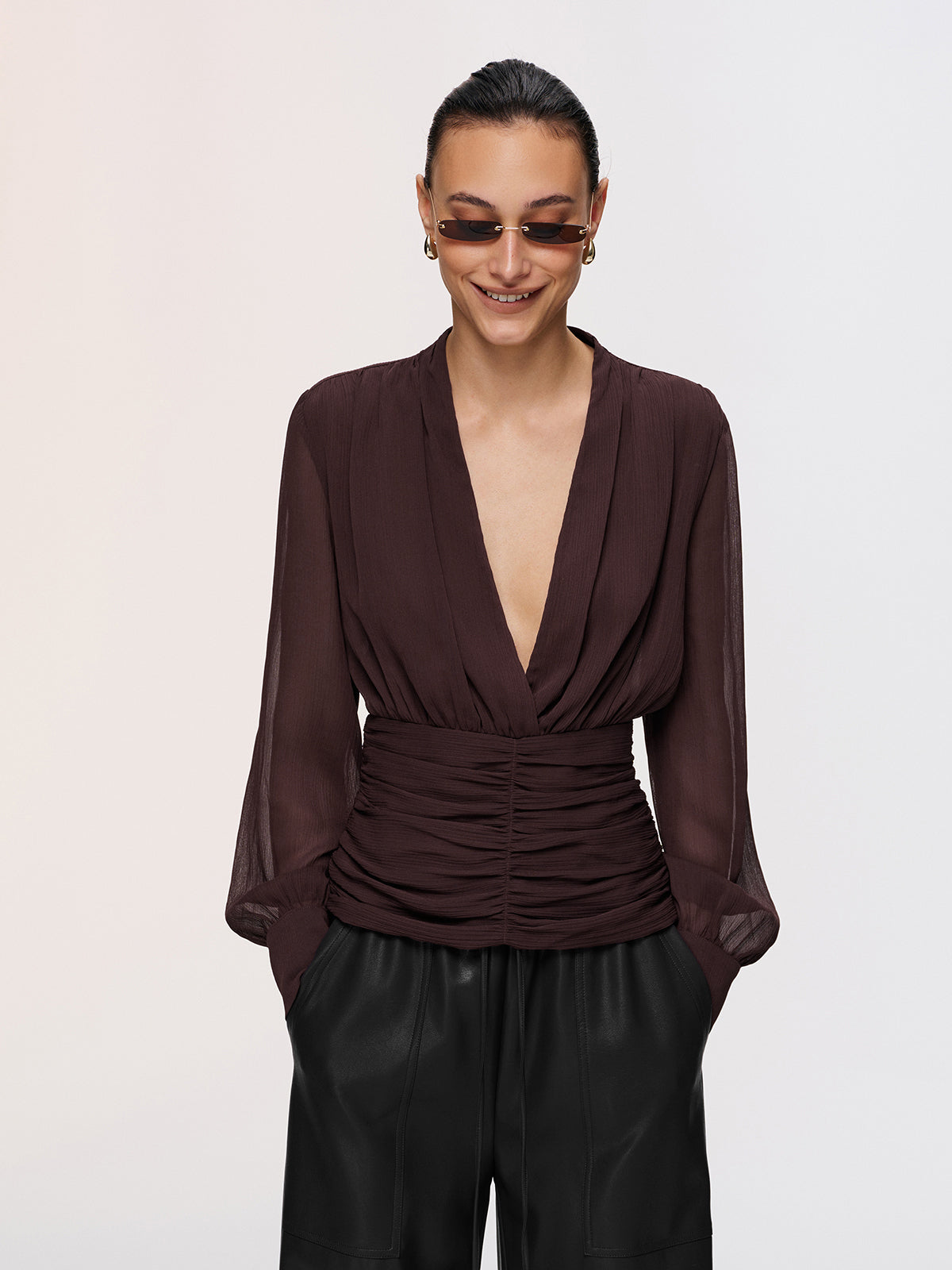 blouses,casual,chiffon,clothing,coll:blouses_shirts,coll:sheer_bare-back,coll:tops,corpcore,cross-over collar,dark brown,feminine,in_six_month,long sleeve,non-stretch,not_low_sales,oa251125074,photo_model,regular,regular fit,ruched,semi-sheer,sheer,tops,women