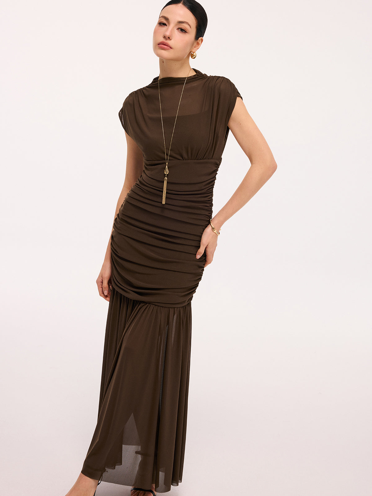 brown,clothing,coll:dresses,coll:sheer_bare-back,corpcore,crew neck,date,drape,dresses,feminine,in_six_month,maxi,medium stretch,mesh,not_low_sales,oa251127094,photo_model,regular,regular fit,ruched,season of love,semi-sheer,sheer,short sleeve,women