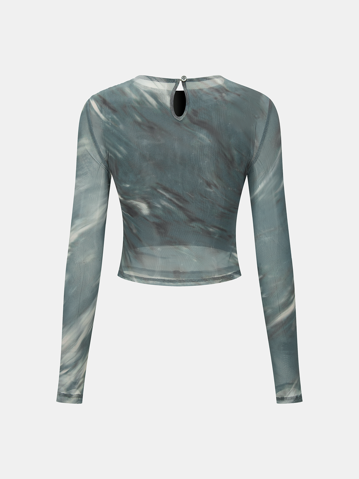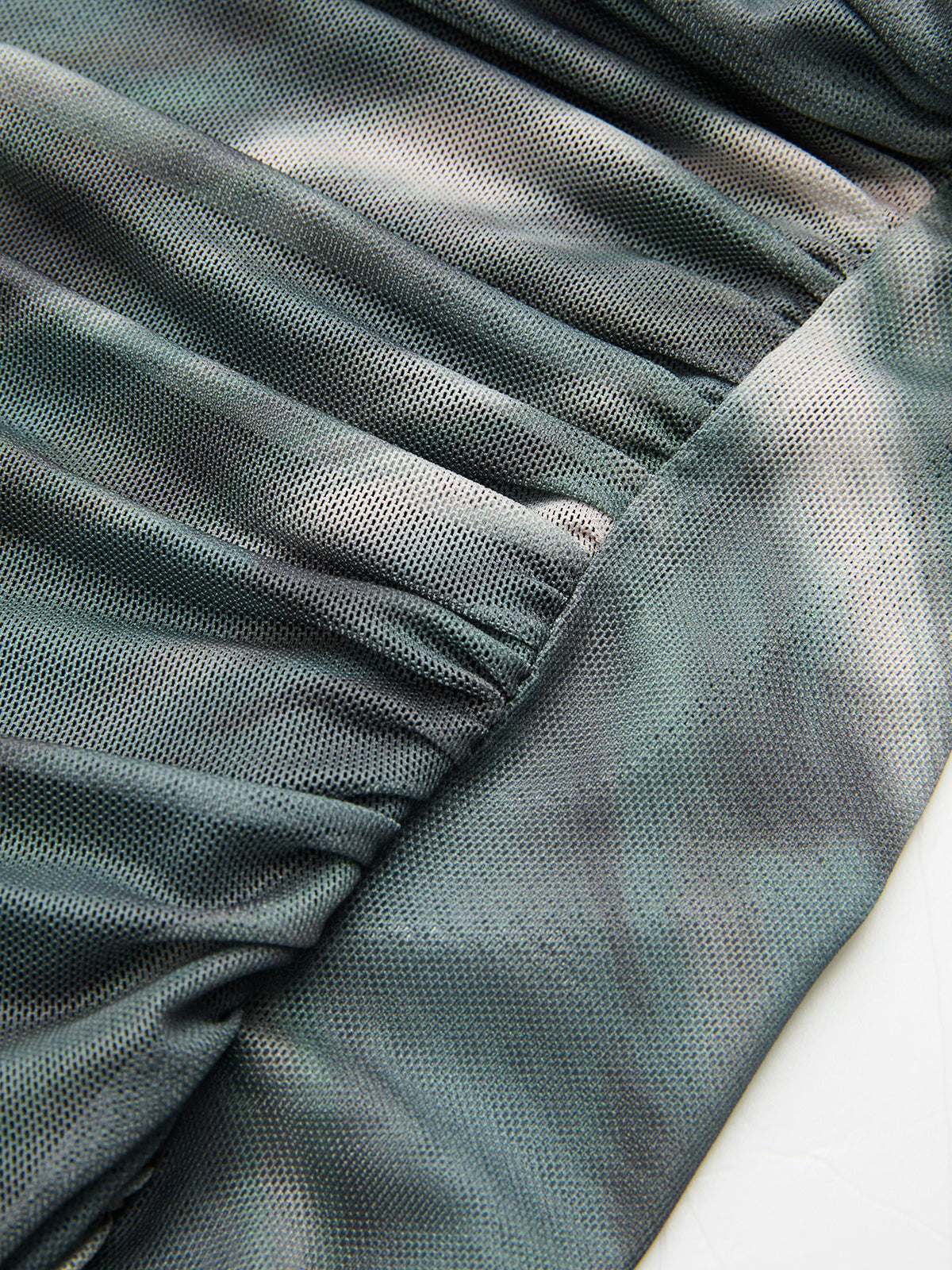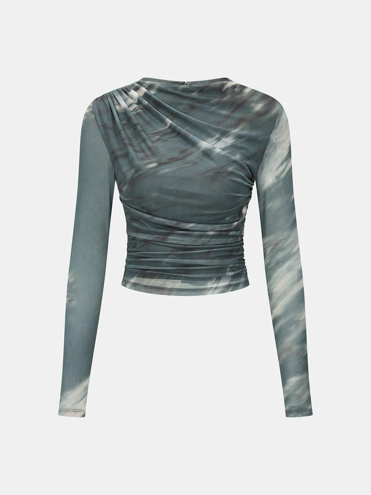 Tie-Dye Mesh Ruched Long-Sleeve Top