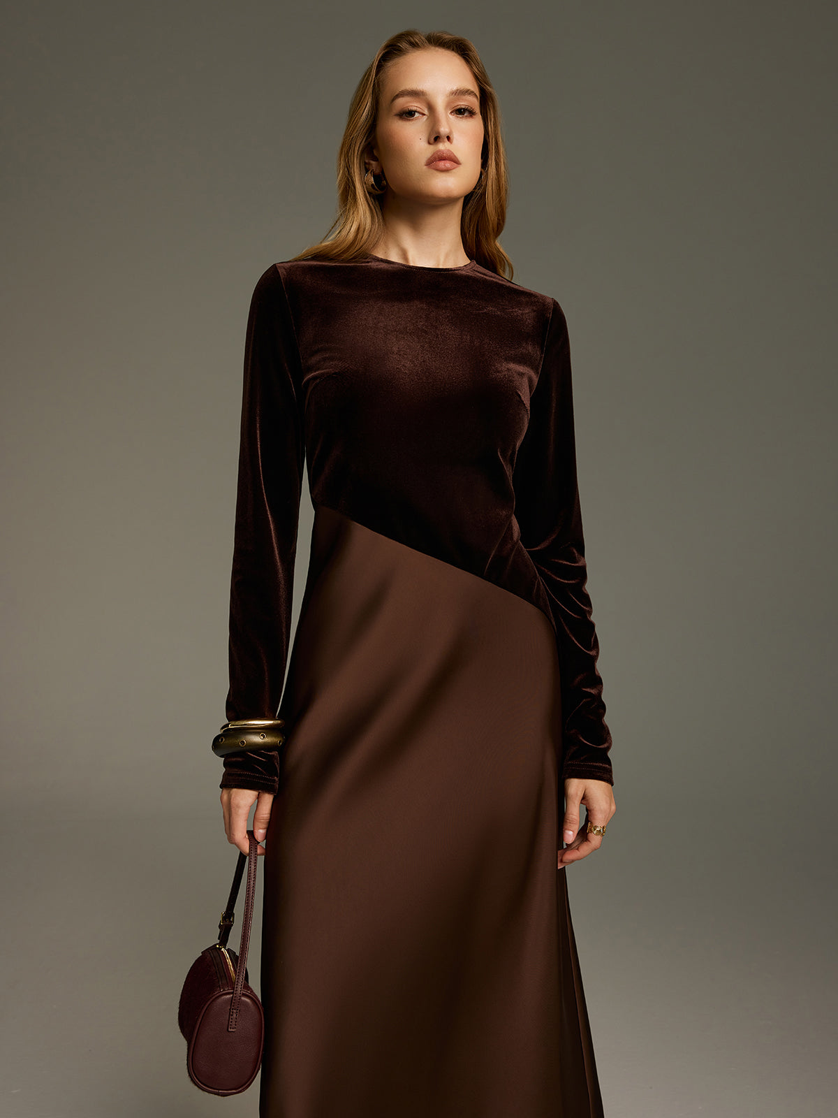 casual,clothing,coll:dresses,coll:vintage_fabrics,crew neck,dark brown,dresses,fall,in_six_month,invisible zipper,long sleeve,maxi,minegence,no,not_low_sales,oa251105061,patchwork,photo_model,regular,regular fit,satin,slight stretch,velvet,winter,women