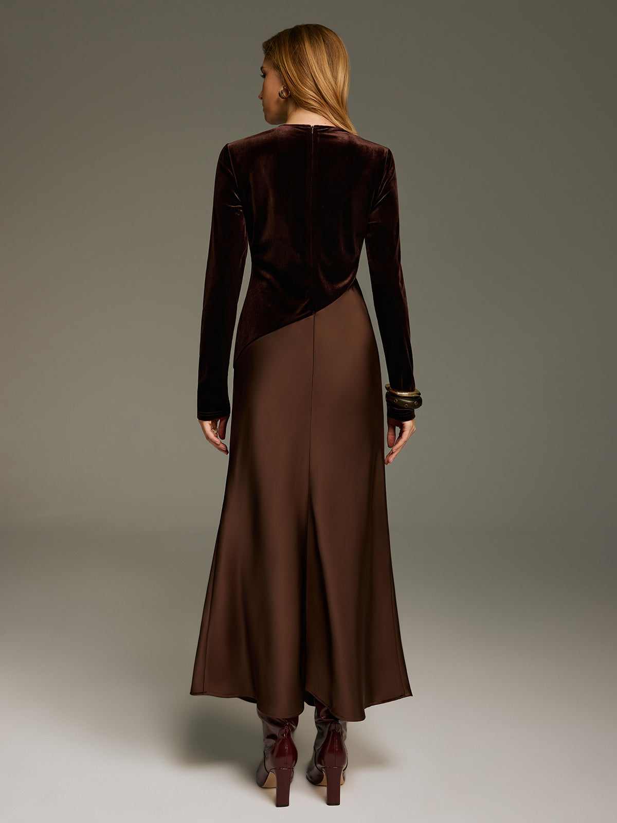 Velvet & Satin Paneled Long Sleeve Maxi Dress