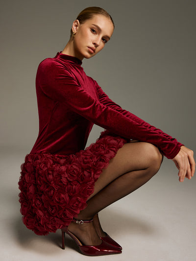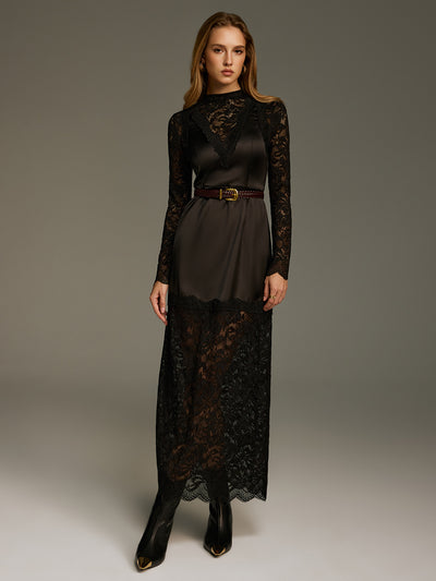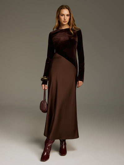Velvet & Satin Paneled Long Sleeve Maxi Dress