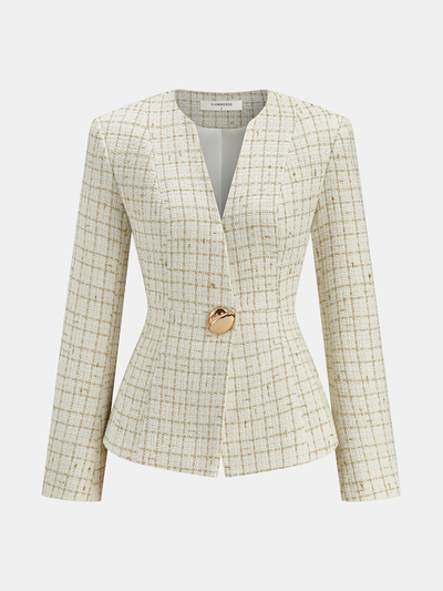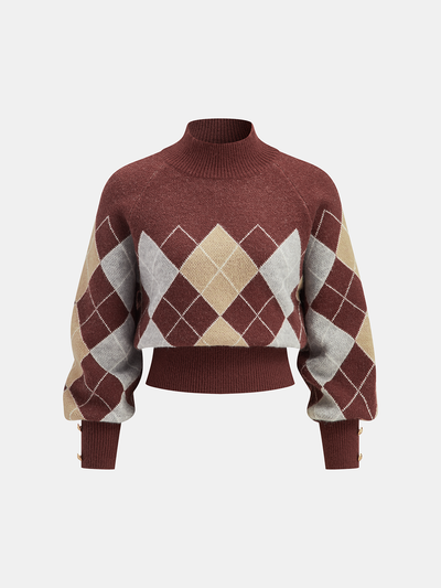 Wool Blend Plaid Asymmetric Collar Buttoned Sweater