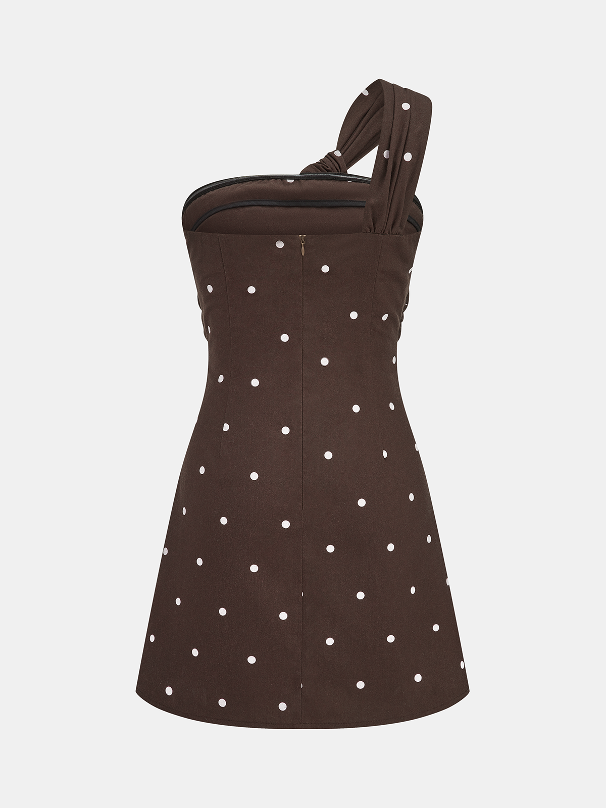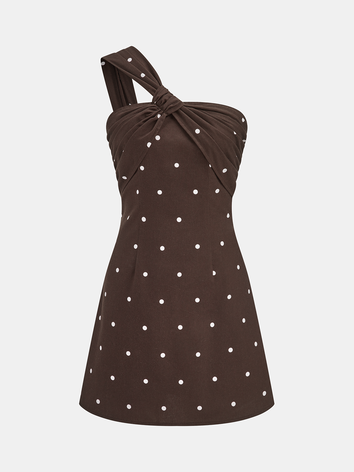 asymmetric,asymmetrical neck,brown,clothing,coll:dresses,coll:linen_cotton,coll:night_glam,coll:short,coll:vacation,coll:weekend_getaway,cotton&linen,dresses,feminine,in_six_month,invisible zipper,mini,no,non-stretch,not_low_sales,oa260108022,party,polka dot,regular,regular fit,ruched,sleeveless,vacation,women