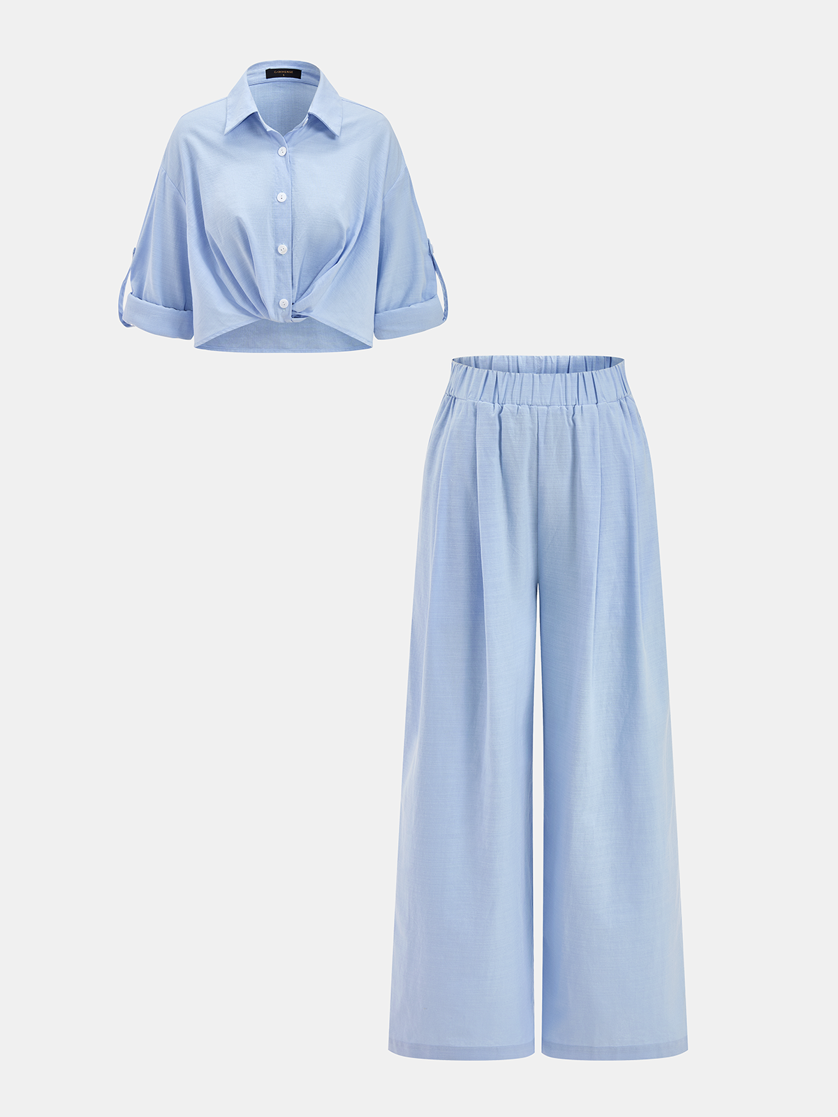 aqua,casual,clothing,coll:bottoms,coll:linen_cotton,coll:matching_sets,coll:vacation,coll:weekend_getaway,coll:wide_leg,collar,cotton&linen,elastic waistband,in_six_month,long sleeve,minegence,no,non-stretch,not_low_sales,oa260228008,pant sets,pleated,regular,regular fit,sets,summer hues,tied&knot,vacation,women