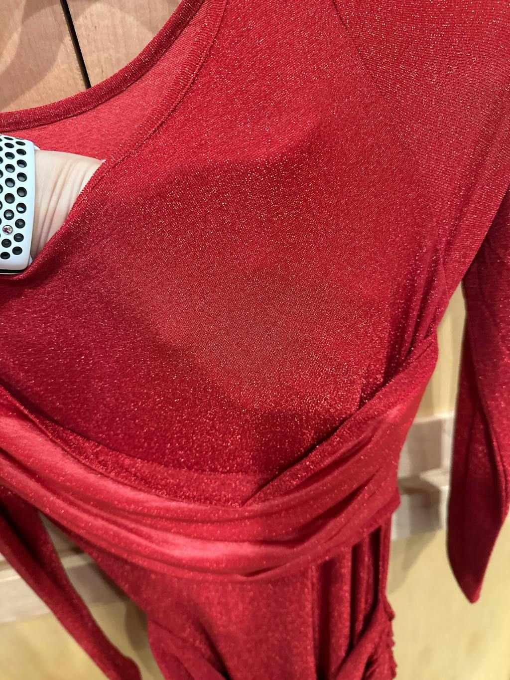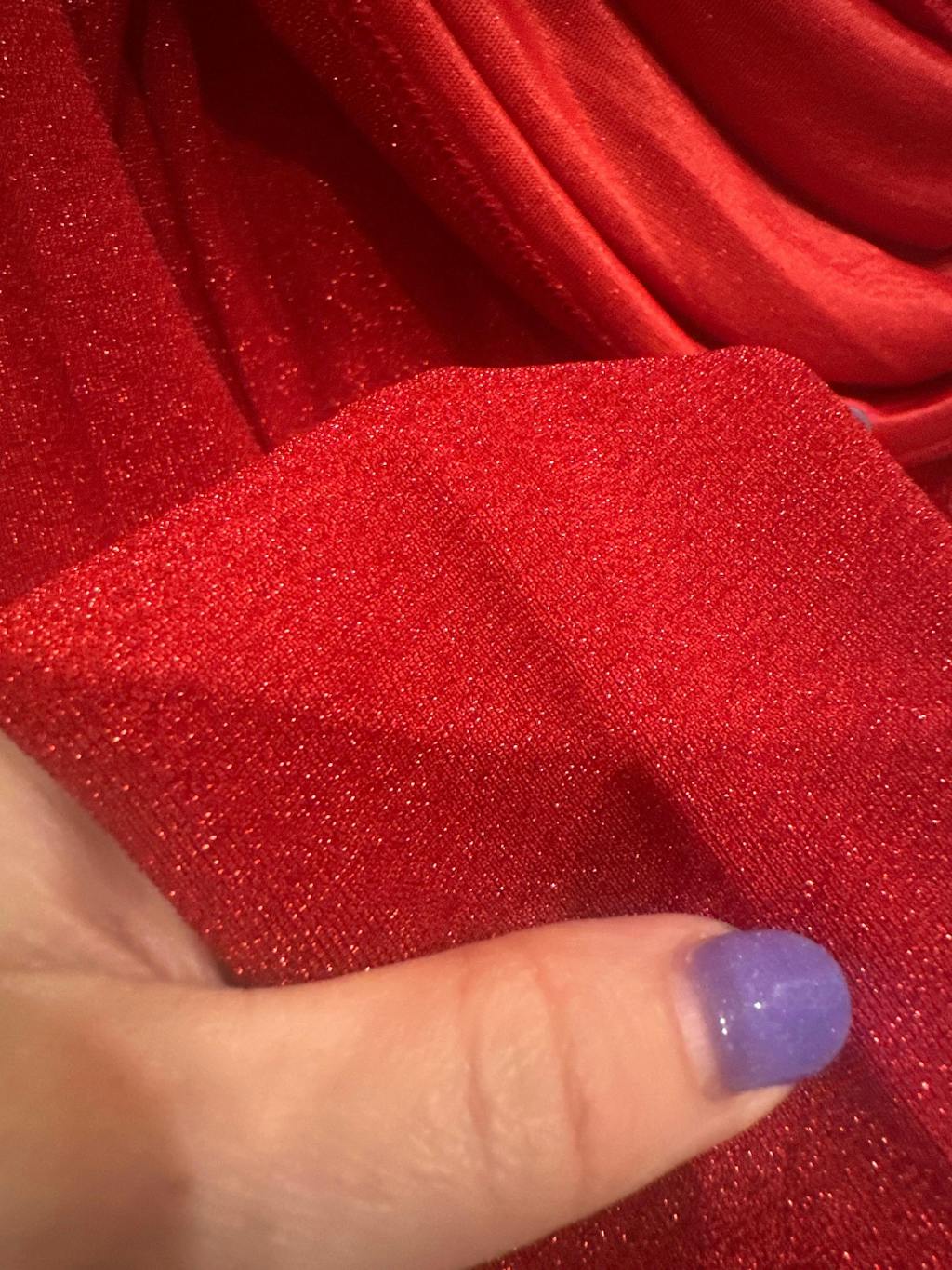 Absolutely gorgeous sleek and elegant gown. Fabric seems to be sheet but it’s not. And beautiful draping. Very stretchy.