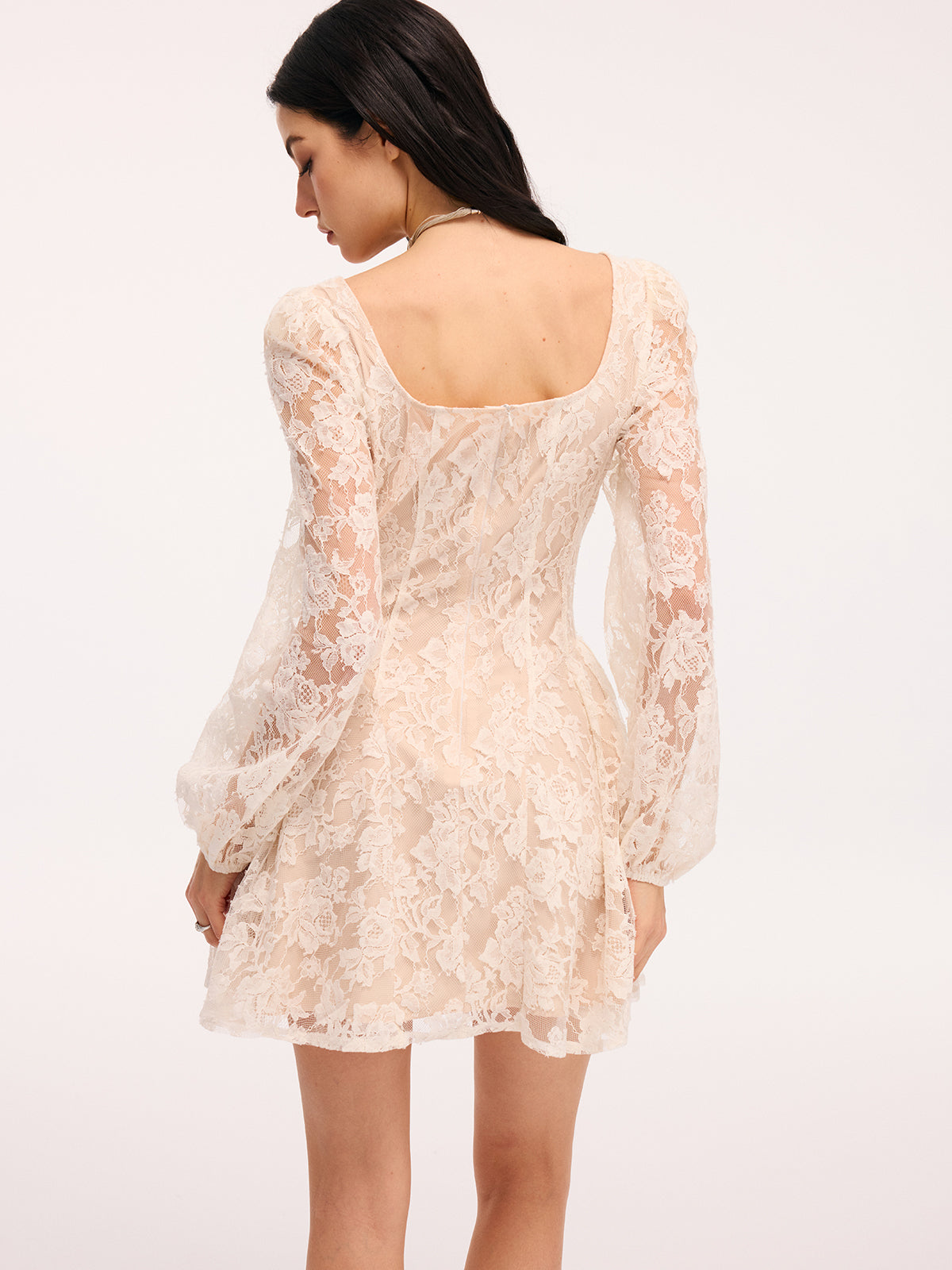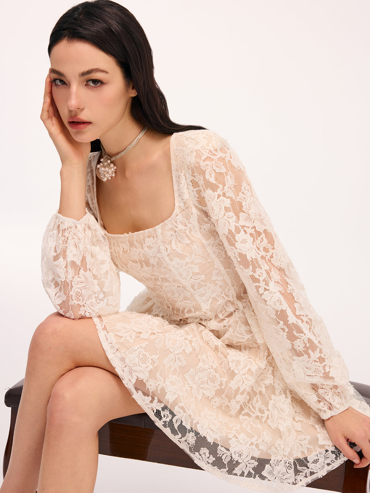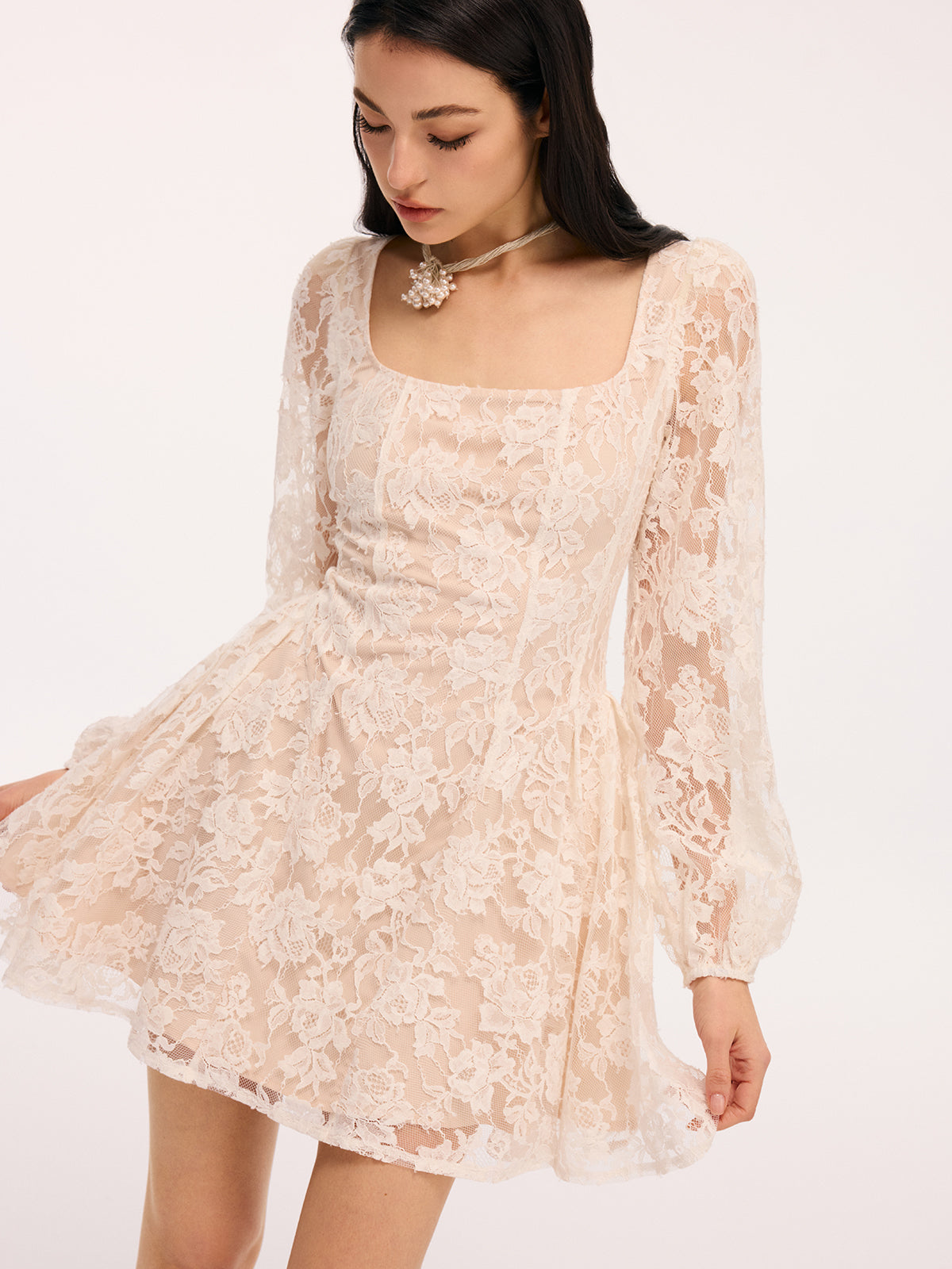 Semi-Sheer Floral Lace Square Neck Mini Dress