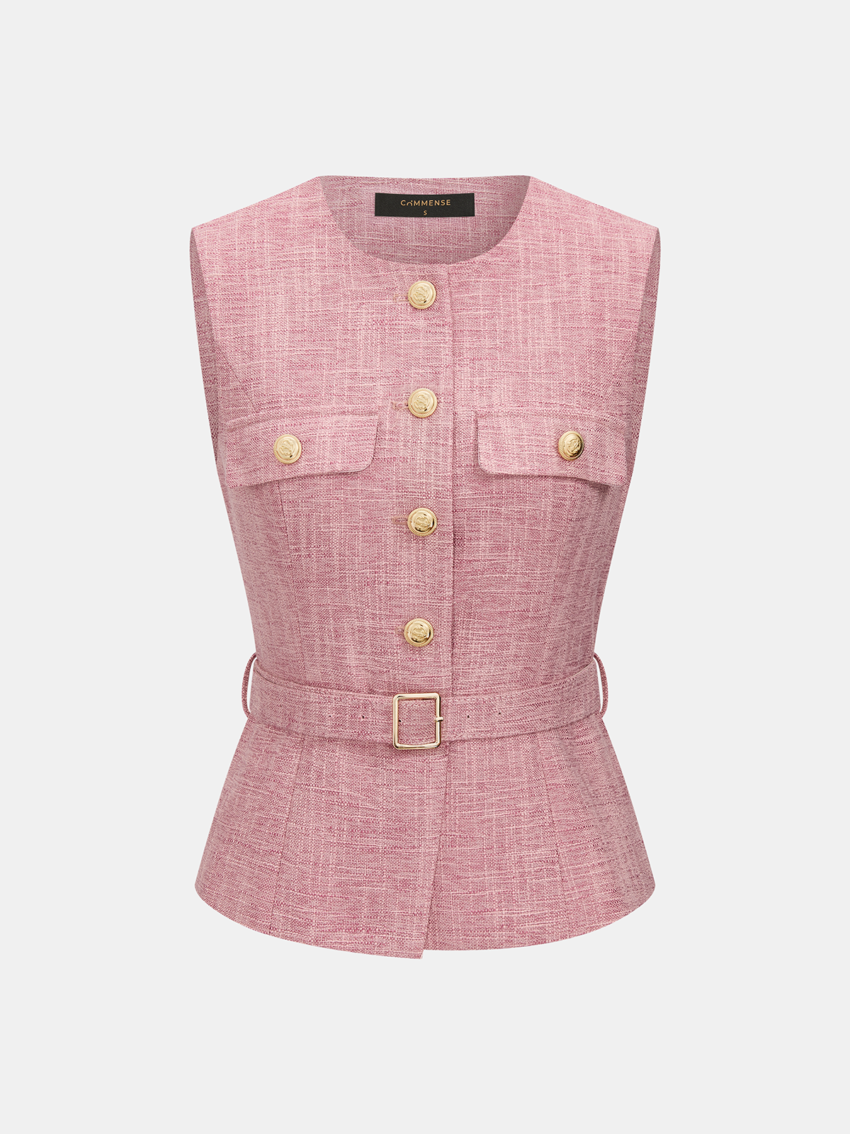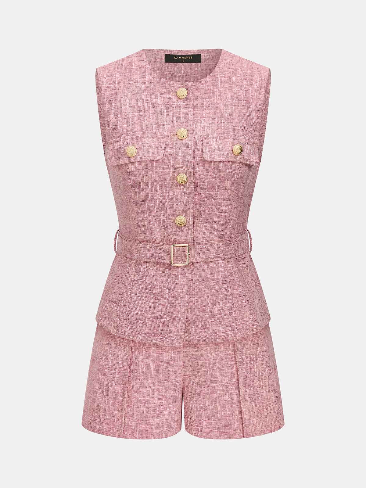 basic - fabric,belted,casual,clothing,coll:matching_sets,coll:shorts,coll:vests,corpcore,in_six_month,minegence,non-stretch,not_low_sales,oa260306007,photo_ai,pink,regular,regular fit,sets,short sets,summer hues,women,woven fabric