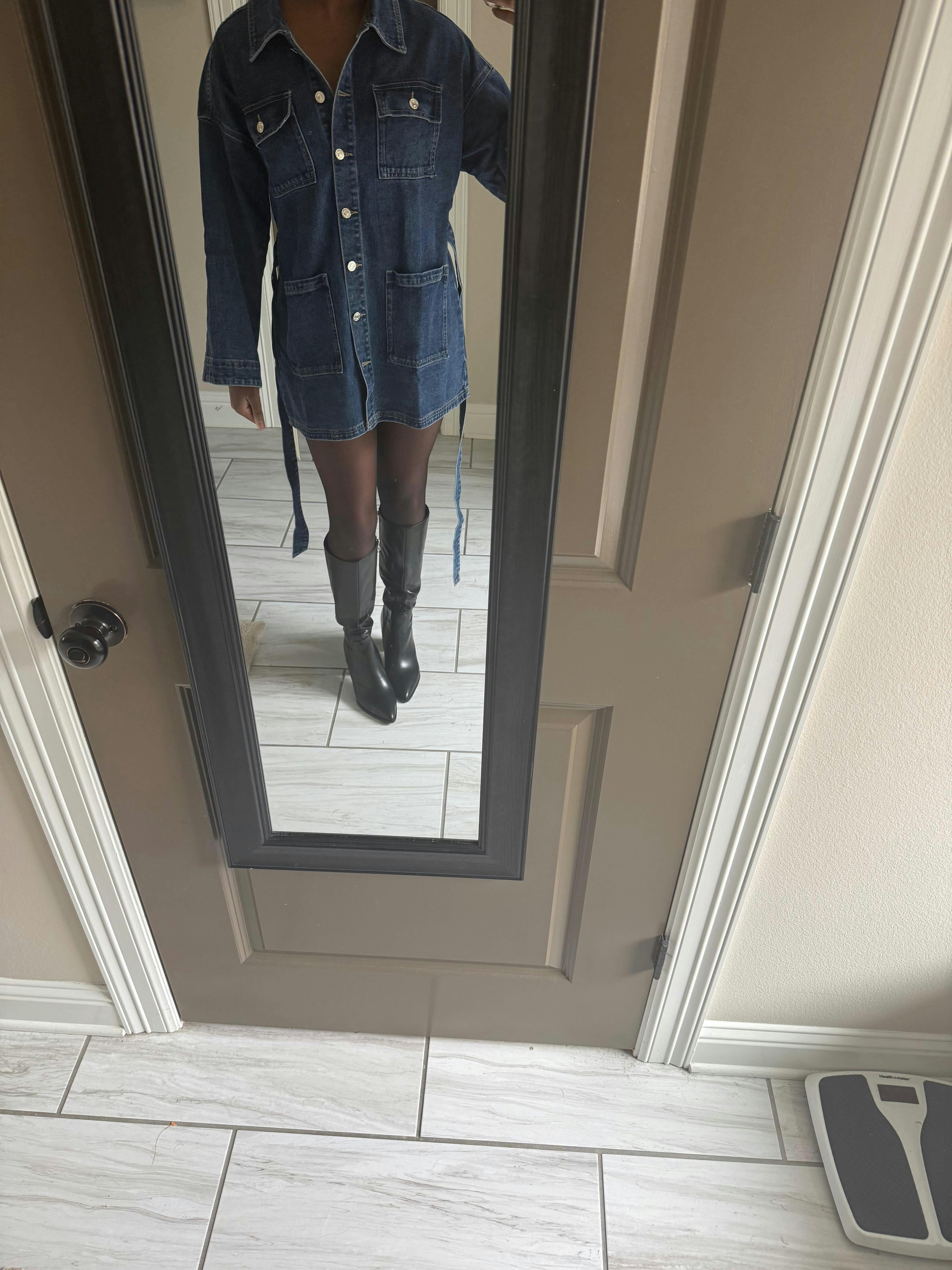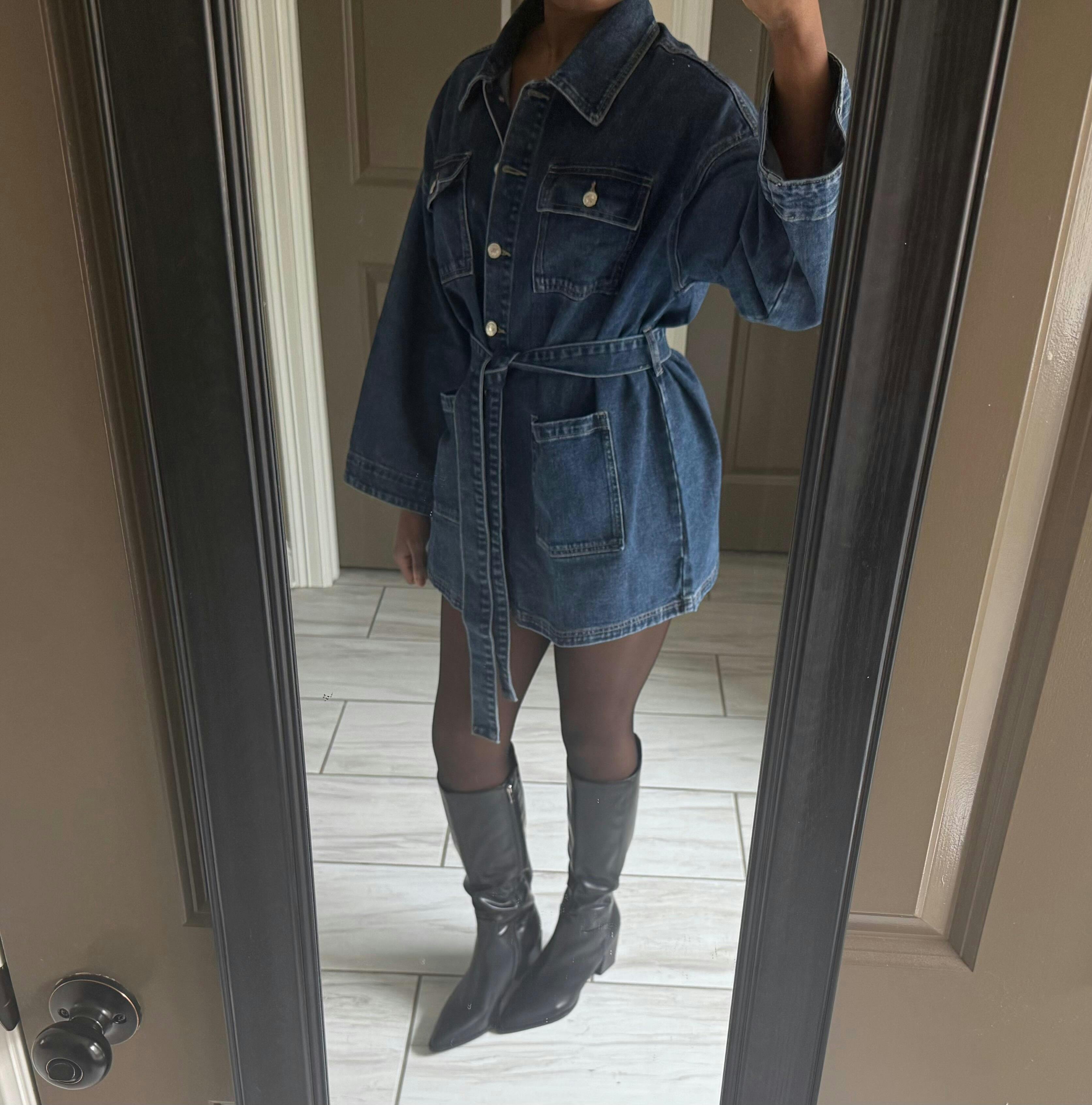 This is a really cute piece. I read the reviews prior to purchasing and agree that it is very oversized if you intend to wear it as a jacket, but I bought it to wear as a dress so I ordered my normal size which is a medium. I will say that it is a bit short if you also want to wear it as a dress, but I plan to wear shorts underneath. The denim is thick and the color is as pictured, but I will say the fabric is a bit itchy and it has a strong smell. For reference, I am 5’8, ~160 lbs, 34B, 30” waist, 41” hips, athletic build.