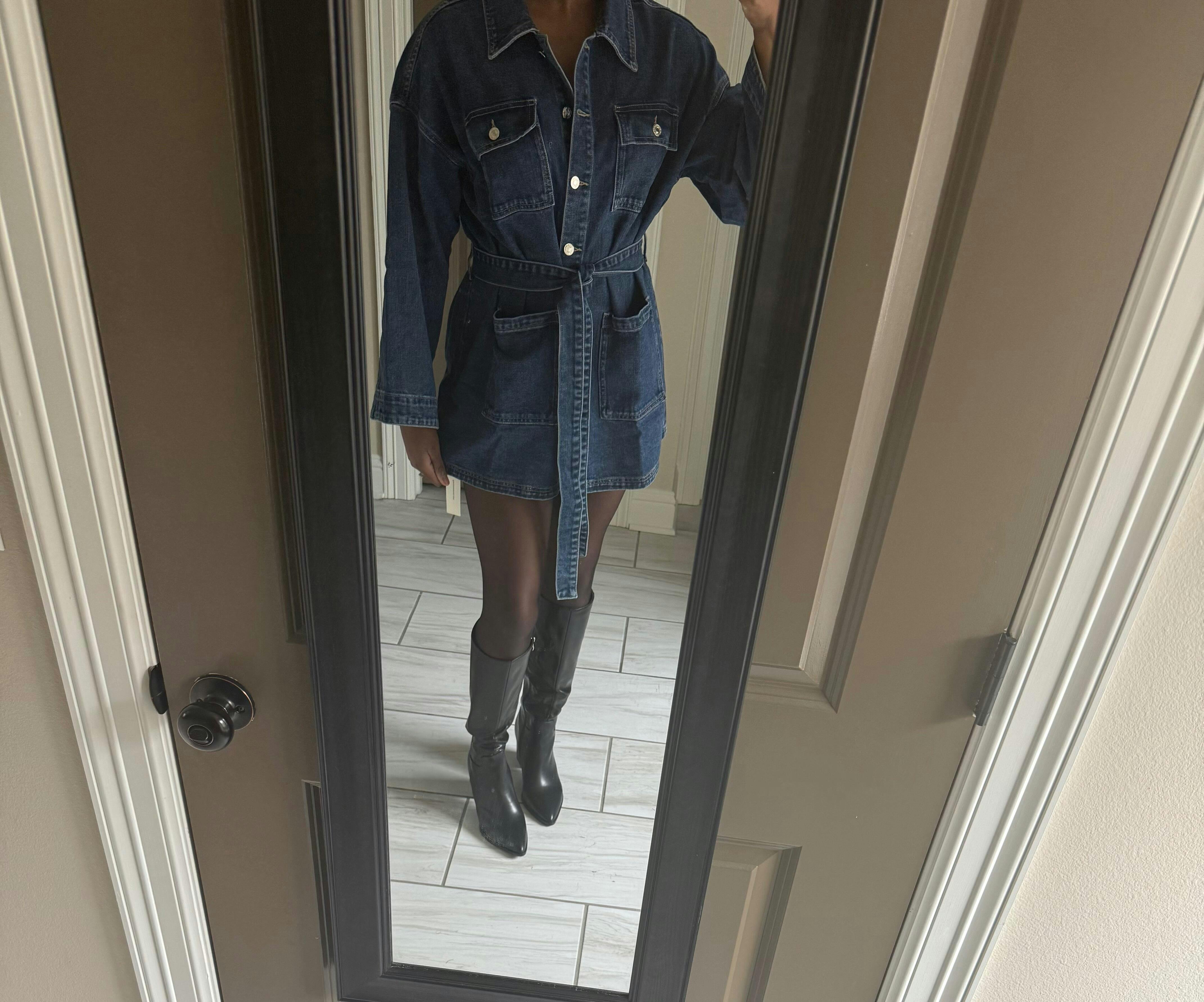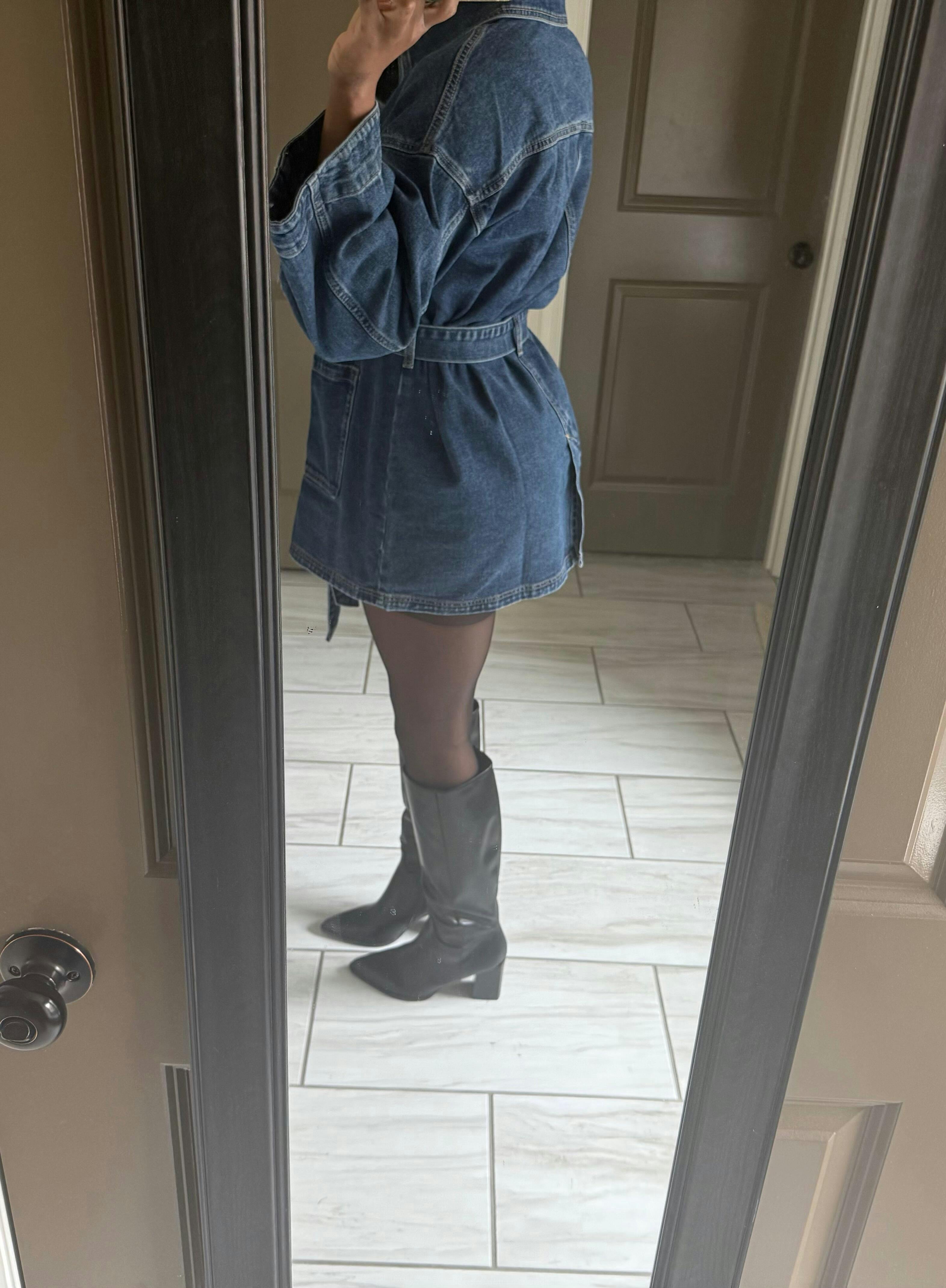 This jacket makes a statement! Such a modern update in the Jean jacket that I’ve moved all my other Jean jackets to the back of the closet. It’s perfect for fall as it’s heavy enough to keep you warm even over a t-shirt and big enough to pair with a sweater on colder days.