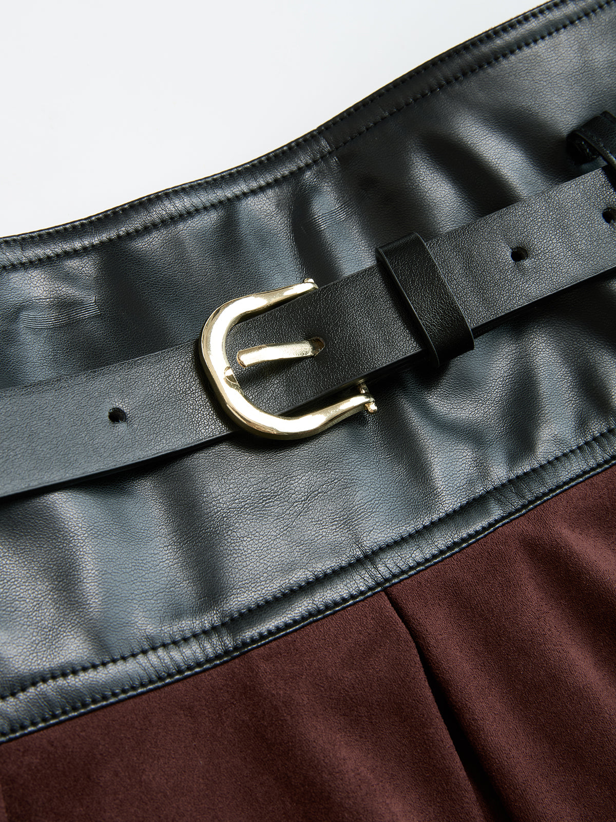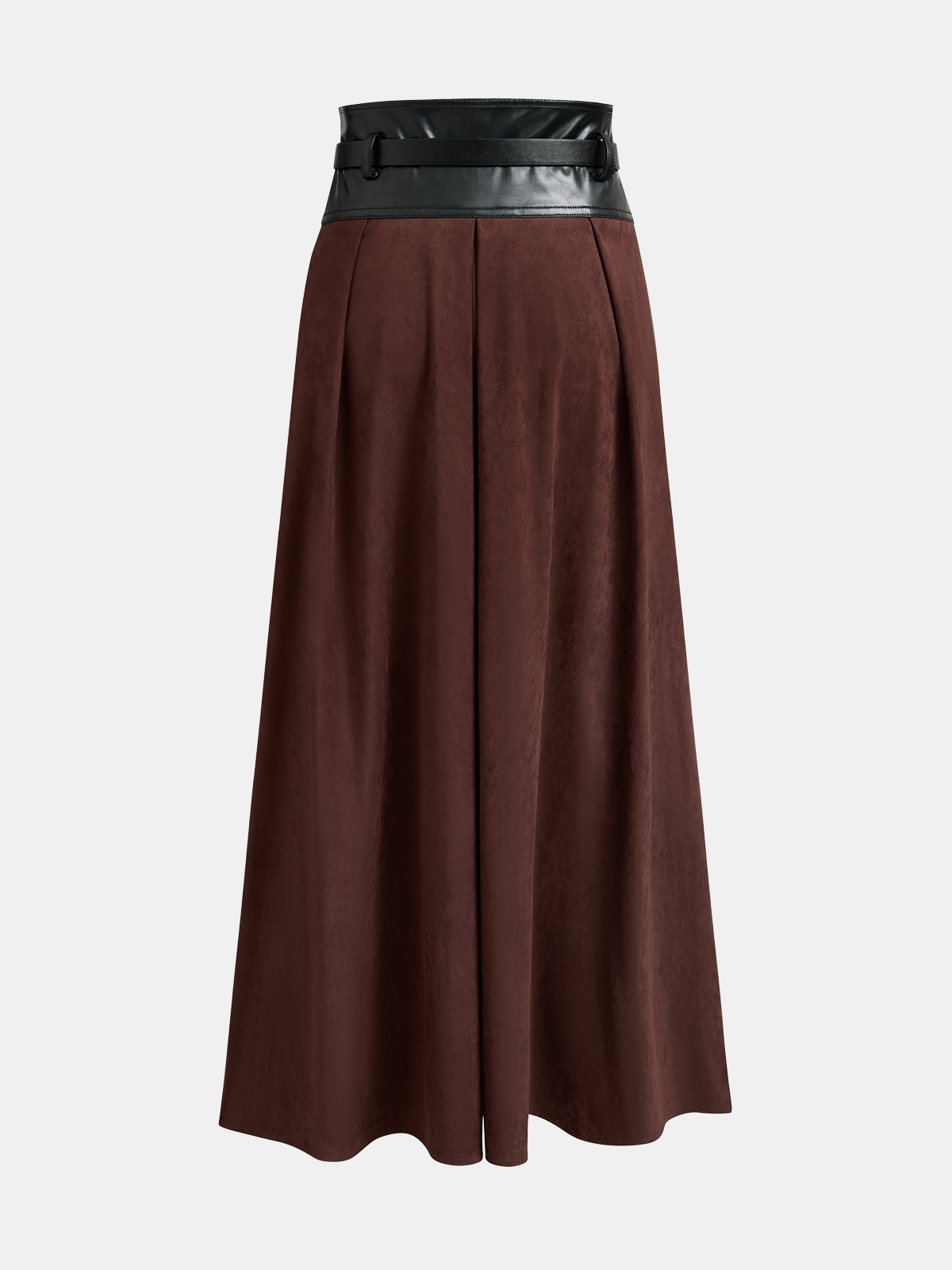 Belted Faux Leather Panel Suede Effect Maxi Skirt