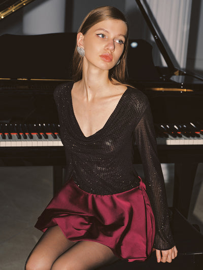Mesh Paneled Velvet Off-Shoulder Long Sleeve Top