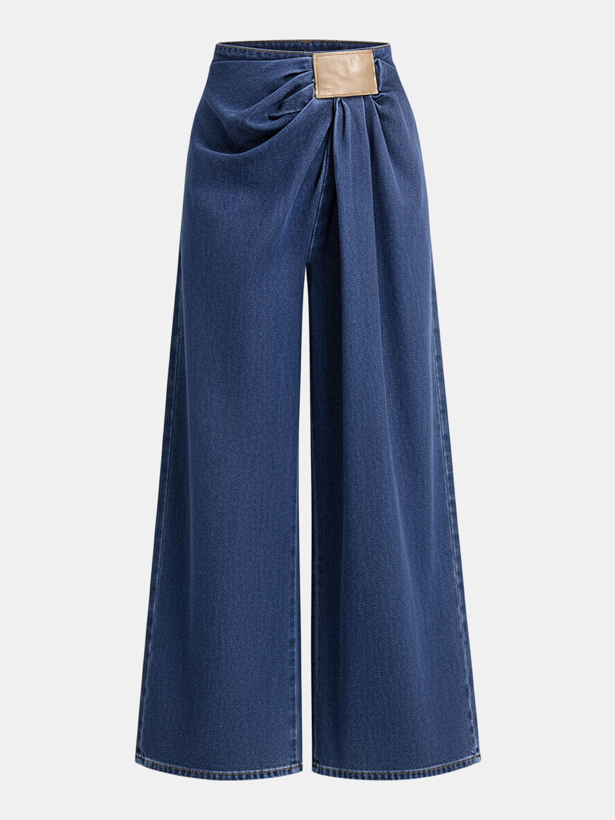 Asymmetrical Ruched Denim Wide-Leg Pants