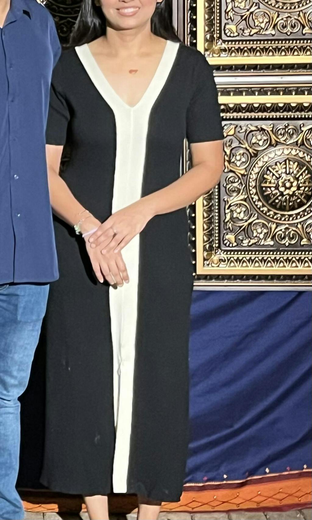 Two Tone V-Neck Knit Slit Midi Dress