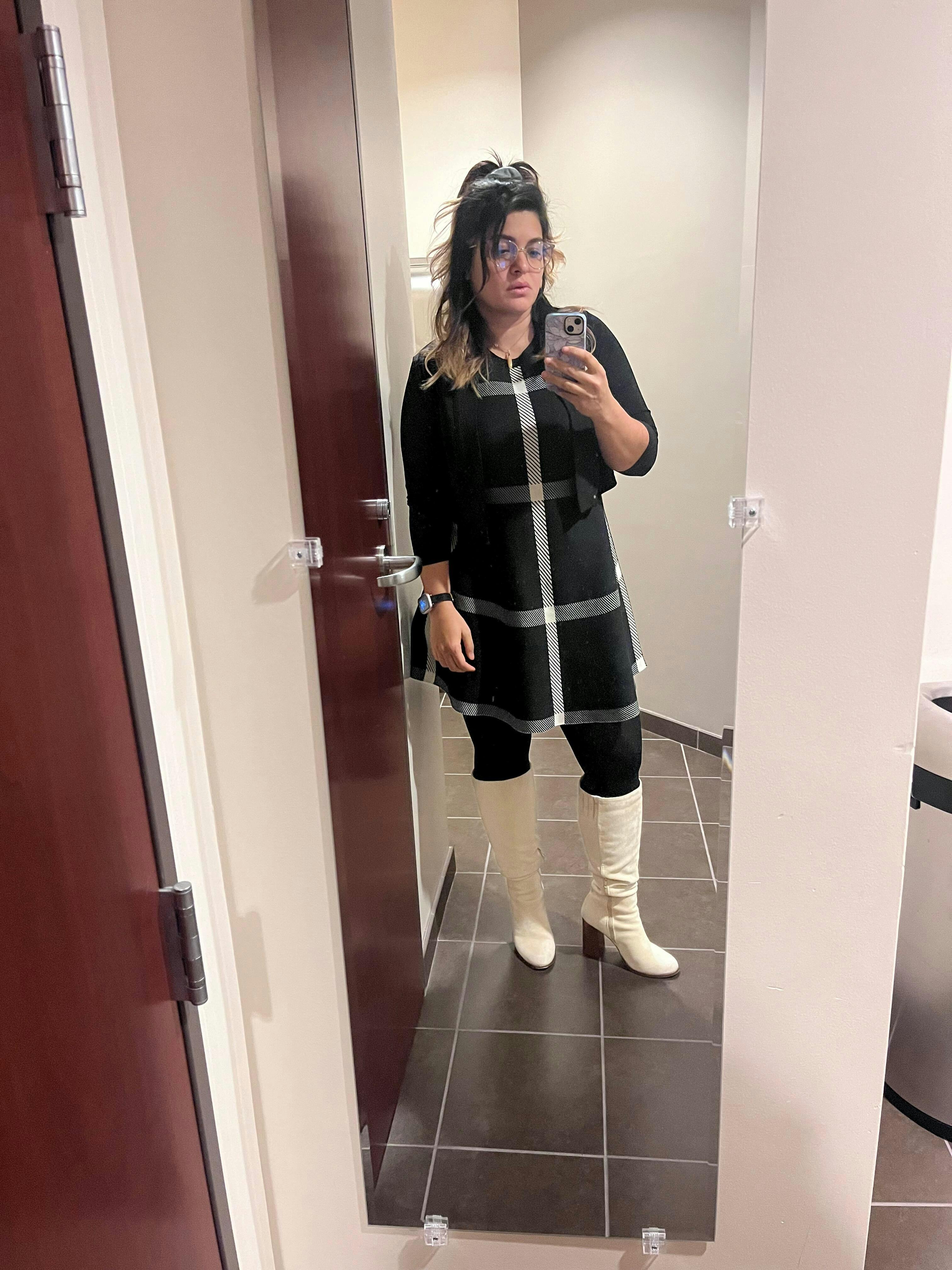 I love this dress. I like the quality, it’s thick enough it’s almost semi structured. Fit it for your top, it’s semi stretchy, and the bottom has a nice flare and length so the hip measurement doesn’t matter a whole lot.
