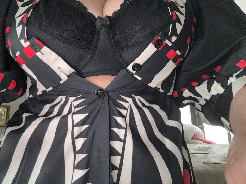 Let me start by saying that due to breast cancer and mastectomy I do not have breasts. I wore this dress to a film festival that was screening a documentary I was in about going flat after mastectomy. I wanted to show that without breasts, I am still happy, healthy and whole. This dress helped me show exactly that. The rest of the fit seemed just right for me. I am 5’9” and 115 pounds. I ordered a small. I’m so glad I ordered this dress!