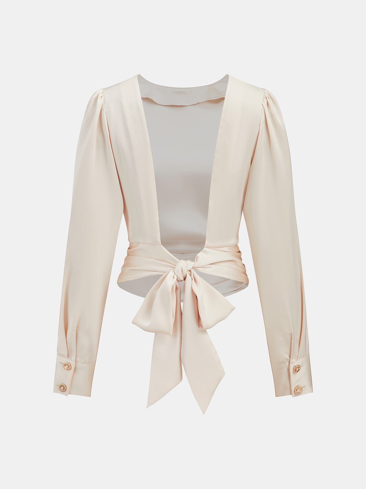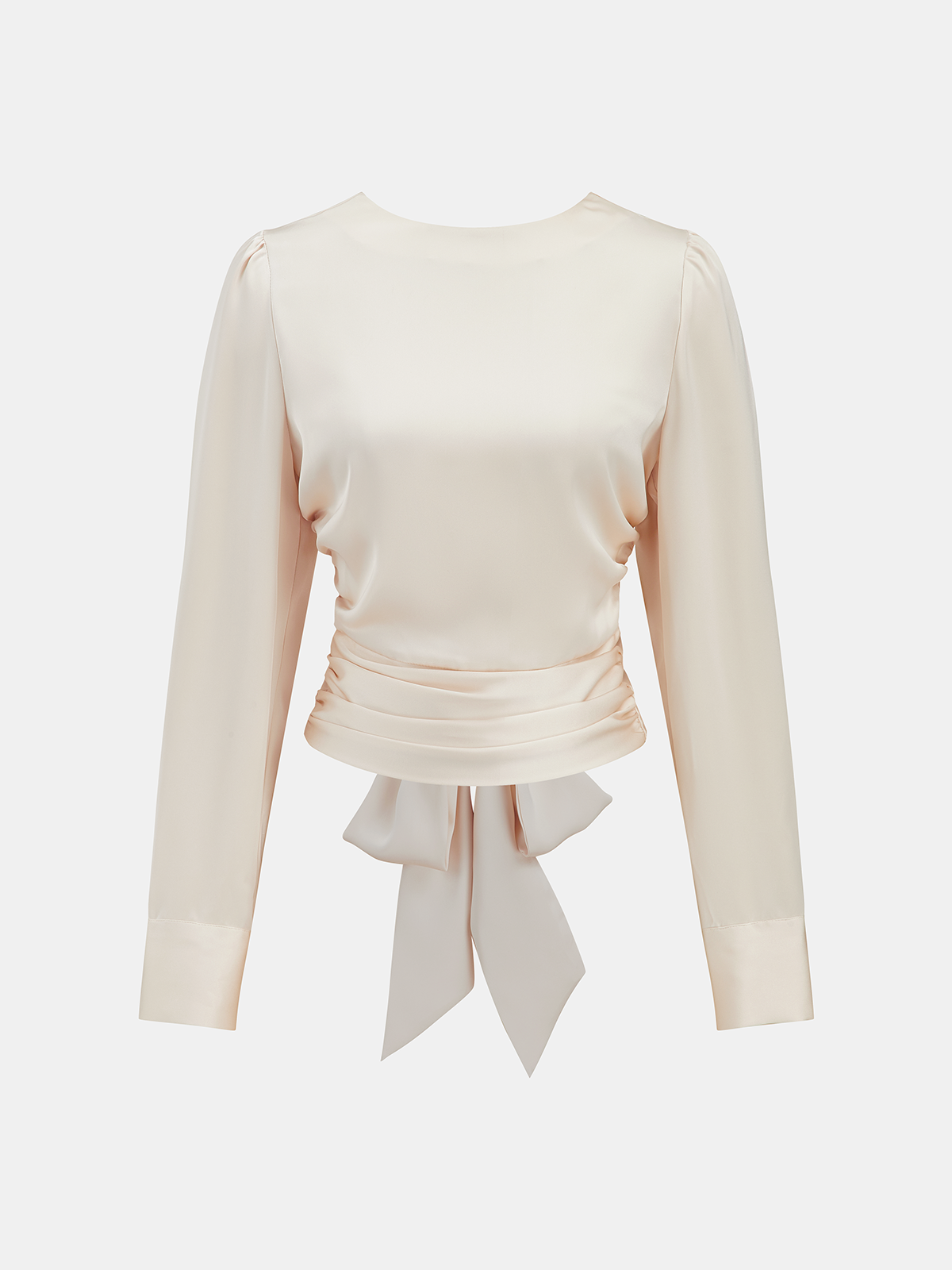 apricot,backless,blouses,bow,clothing,coll:blouses_shirts,coll:night_glam,coll:sheer_bare-back,coll:tops,crew neck,date,feminine,in_six_month,long sleeve,no,non-stretch,not_low_sales,oa251126002,party,regular,regular fit,ruched,satin,tops,women