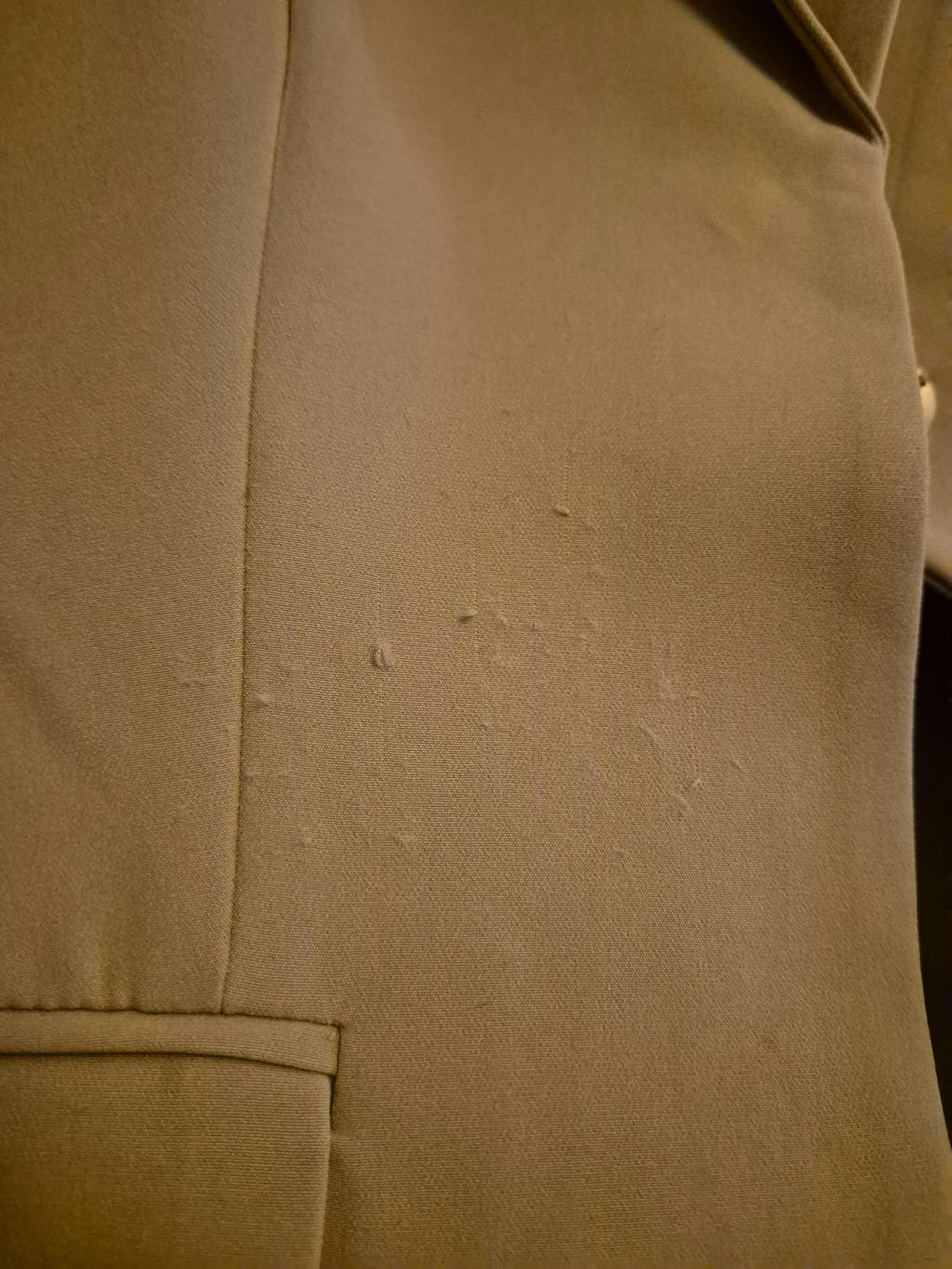 Very disappointed with quality, worn once and this is how it looks like now. The collar can't even be ironed, just wrinkles back up like on the picture and the material is awful.