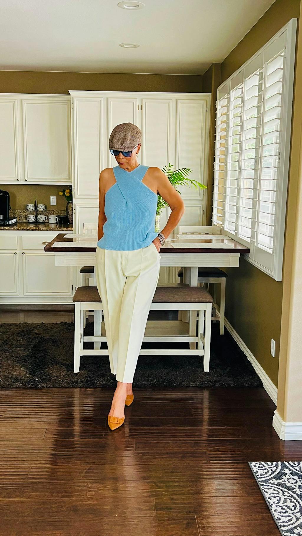 Great top! Very comfortable, well made and versatile. The blue color is beautiful. I get a million compliments when I wear it