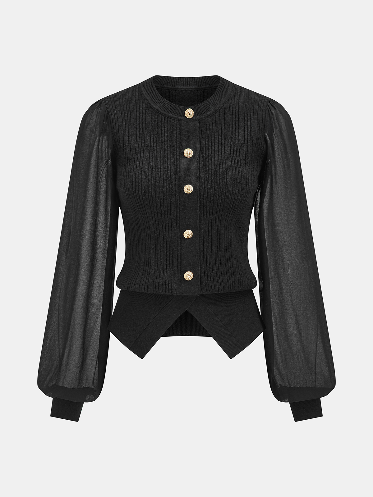 Sheer Sleeve Metal Button Ribbed Knit Cardigan
