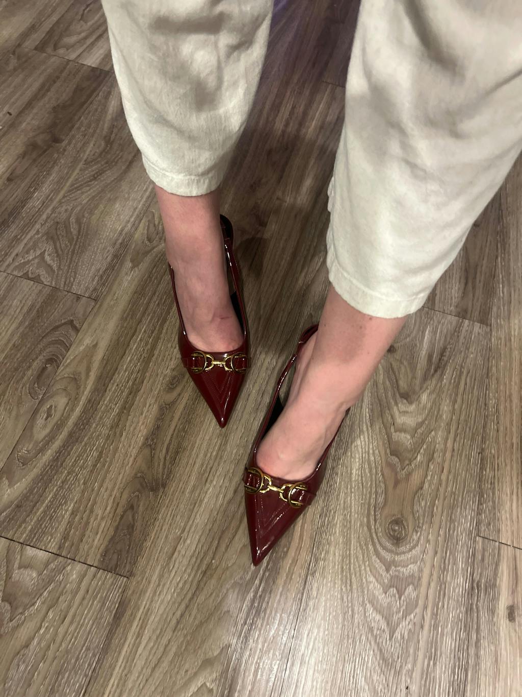 Beautiful Slingback shoes with nice thicker heel for better stability. The sling back has a piece of elastic in the strap around so you can accommodate your foot for the right fit. I chose to order 1/2 size larger than I usually get (size 8.5) because of the pointed toe. It is not excessively pointy but with the larger size, I feel my toes fit more comfy in the shoe. The patent is not a stiff patent and the rest of the shoe is a leather looking material. These are well made and worth your purchase.