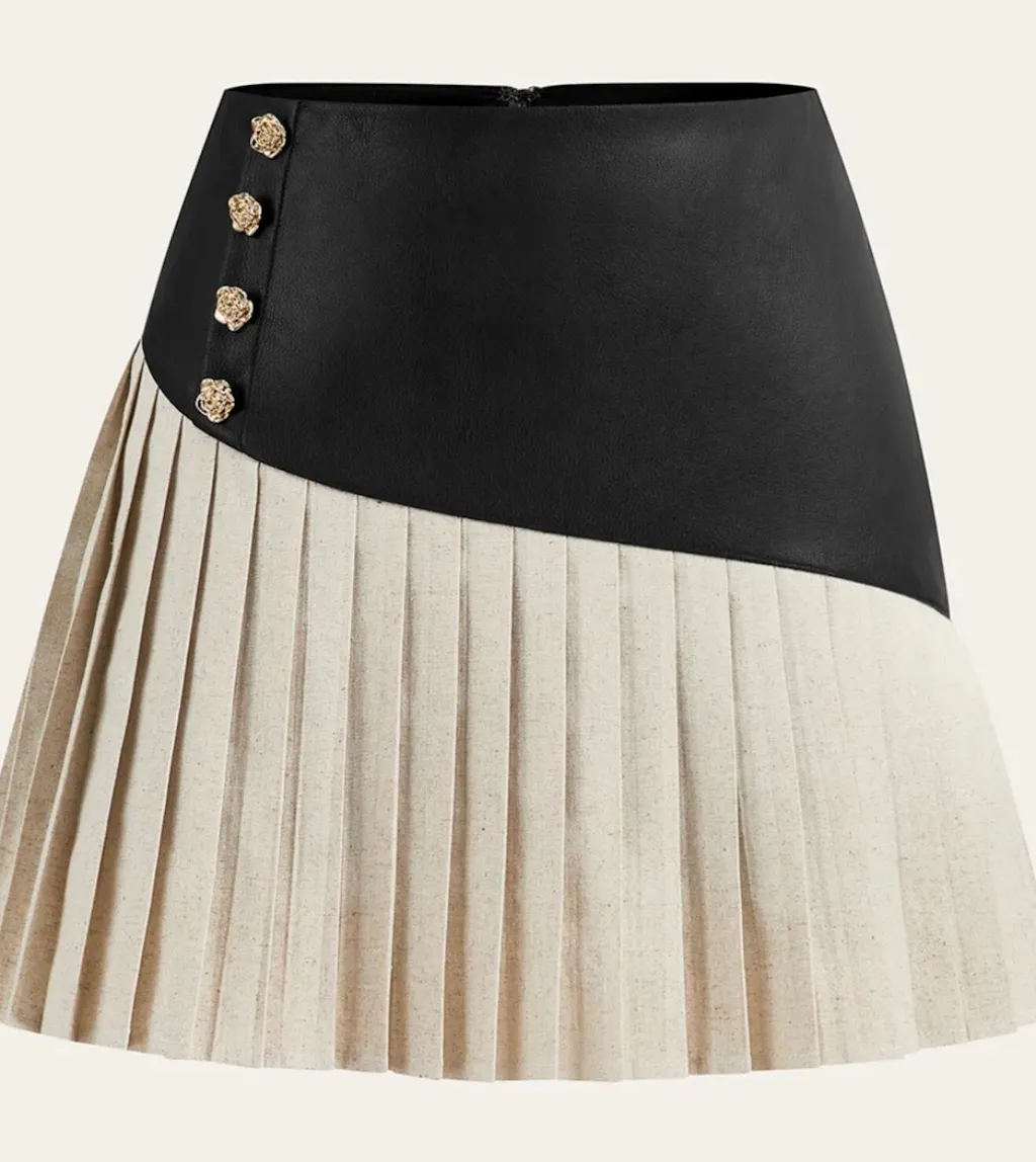 PU Panel Cotton & Linen Pleated Mini Skirt