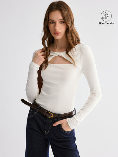 Fitted Long-Sleeve Rib-Knit Top with Metal Button