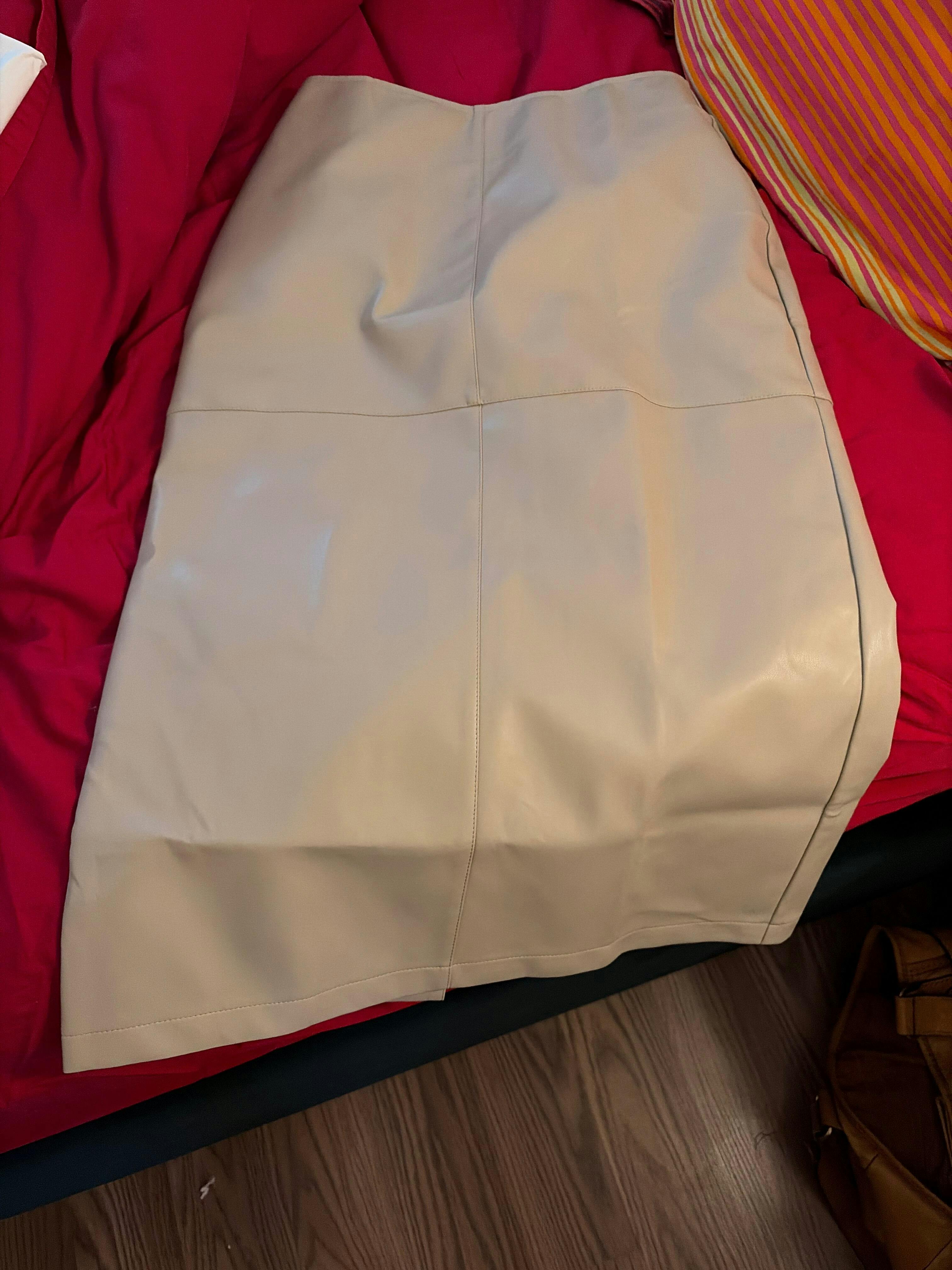 Skirt is amazing, made v well, faux leather looks really good! Love the details w the seams going across & slit in the back,, beautiful skirt, doesn’t look plastic or cheap at all. Fits perfectly also.