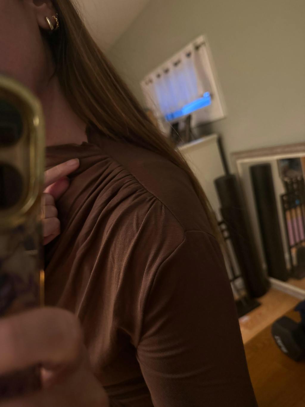 The shirt is cute and will go with anything. The ruching is a flattering fit. The neck line is a little awkward but still a cute top.