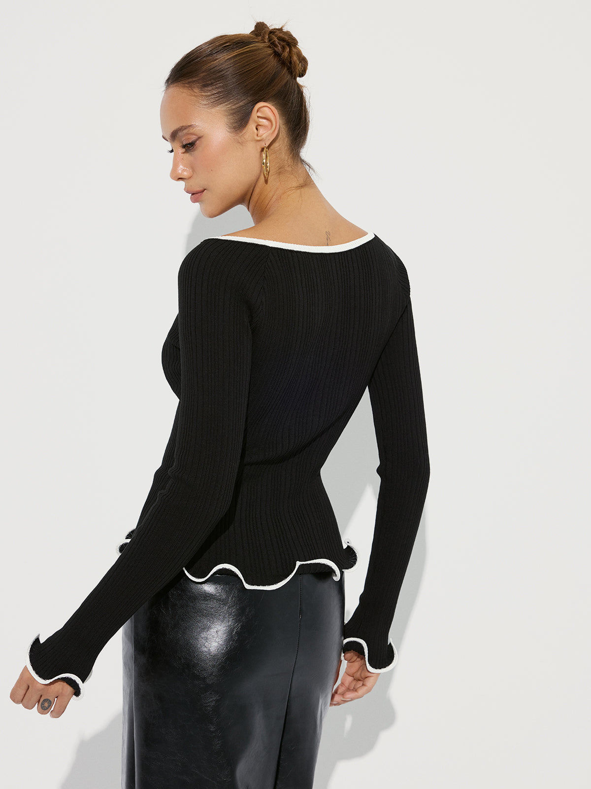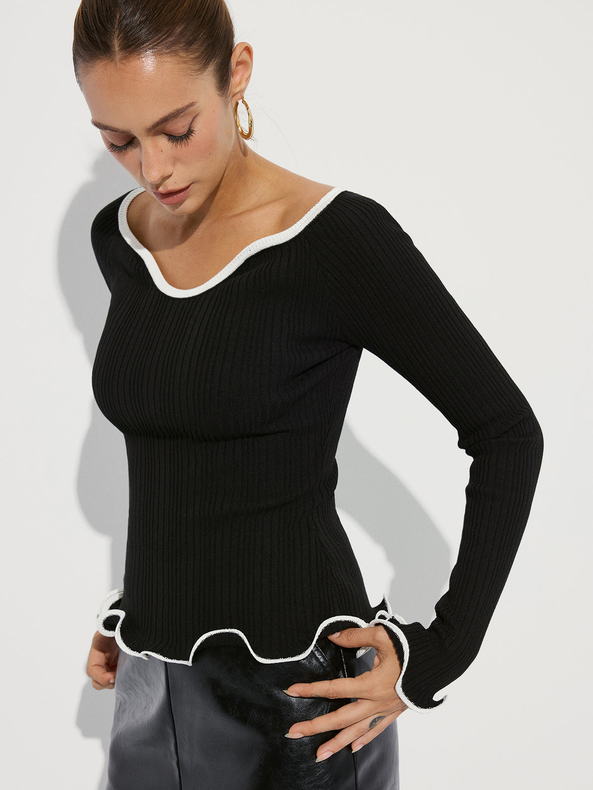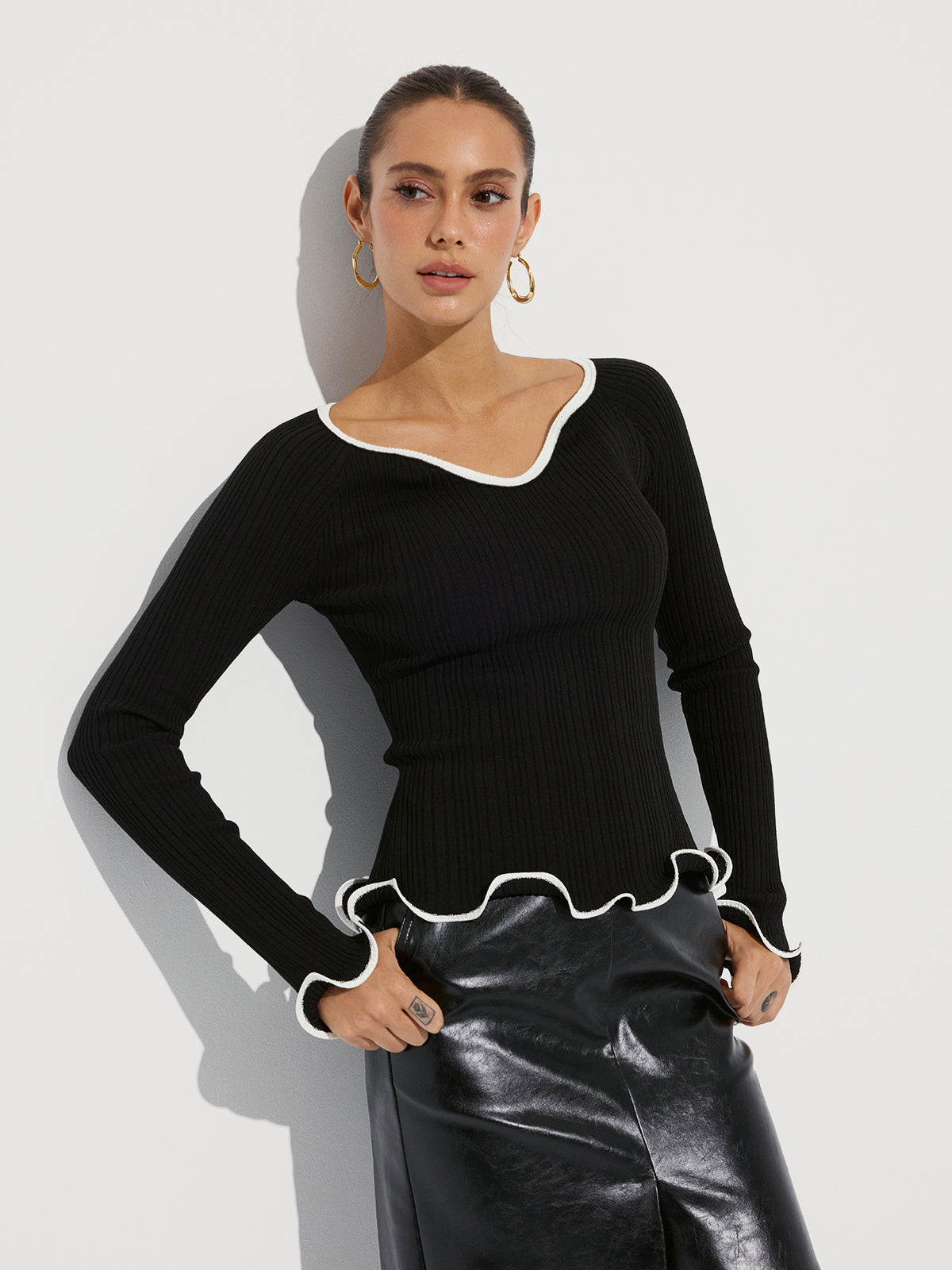 blackandwhite,casual,clothing,coll:knitwear,coll:sweater_tops,coll:sweaters_cardigans,coll:tops,coll:trending,contrast piping / trim,corpcore,fall,in_six_month,knit,knitwear,low_sales,minegence,oa250903036,photo_model,regular,ruffle,slight stretch,slim fit,sweaters,winter,women