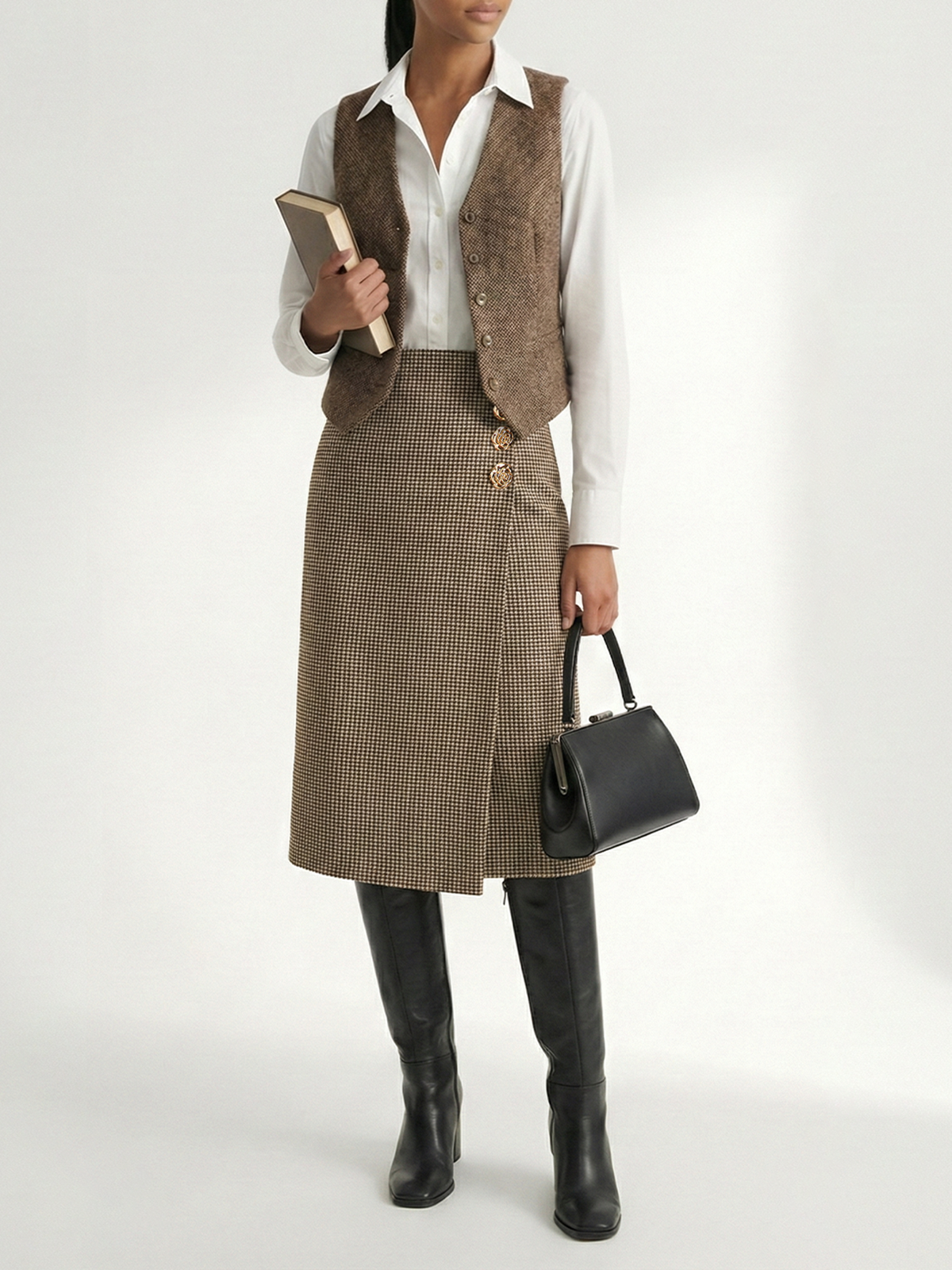 bottoms,clothing,coll:bottoms,coll:old_money,coll:plaids_polka,coll:skirts,coll:vintage_fabrics,corpcore,dark brown,date,feminine,in_six_month,invisible zipper,metal detail,mid waist,midi,no,non-stretch,not_low_sales,oa251010091,photo_ai,plaid,regular,regular fit,skirts,tweed,women