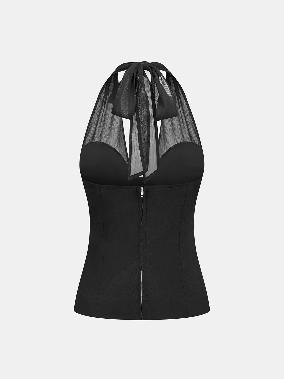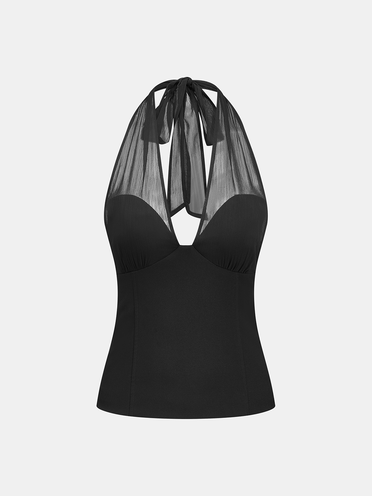 black,casual,clothing,coll:matching_sets,coll:sheer_bare-back,coll:shorts,halter,in_six_month,invisible zipper,minegence,no,not_low_sales,oa260202010,patchwork,regular,regular fit,sets,sheer,short sets,slight stretch,women,woven fabric